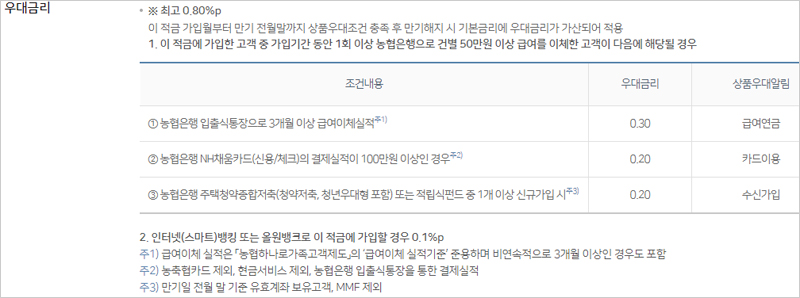 1. 이 적금에 가입한 고객 중 가입기간 동안 1회 이상 농협은행으로 건별 50만원 이상 급여를 이체한 고객이 다음에 해당될 경우