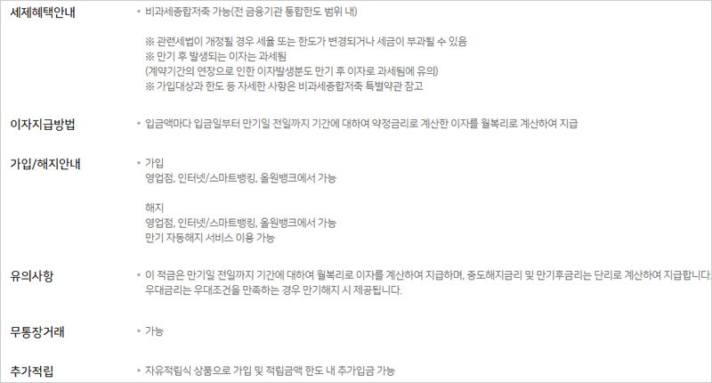 ▶ 이 적금은 만기일 전일까지 기간에 대하여 월복리로 이자를 계산하여 지급하며, 중도해지금리 및 만기후금리는 단리로 계산하여 지급합니다. 우대금리는 우대조건을 만족하는 경우 만기해지 시 제공됩니다.