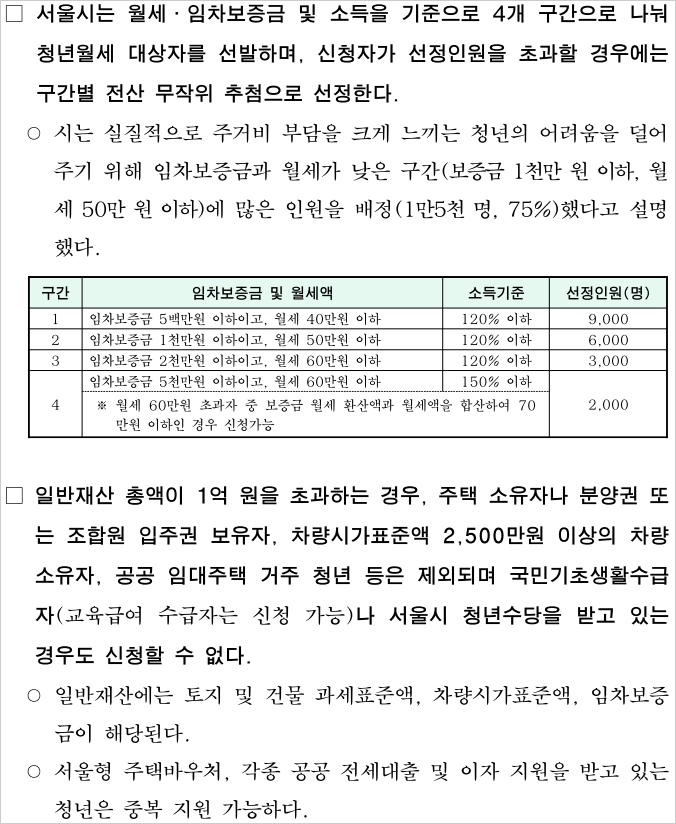 서울시는 월세 및 임차보증금 및 소득을 기준으로 4개 구간으로 나눠 청년월세 대상자를 선발한다고 합니다. 신청자가 선정인원을 초과할 경우에는 구간별 전산 무작위 추첨으로 선정한다고 합니다. 서울시 실질적으로 주거비 부담을 크게 느끼는 청년의 어려움을 덜어주기 위해 임차보증금과 월세가 낮은 구간(보증금 1000만원 이하, 월세 50만 원 이하)에 많은 인원을 배정(1만5000명, 75%)했다고 합니다.