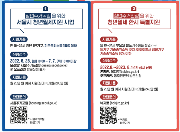 참고로 서울시는 코로나19 등으로 최근 주거비 부담이 더 커진 주거위기 청년을 돕고자 국비를 지원받아 '청년월세 한시 특별지원'도 시행할 예정이라고 합니다. 8월부터 1년 간 수시로 신청을 받으며, 최장 12개월 동안 월 최대 20만원 씩 지원한다고 합니다. 청년월세 한시 특별지원은 서울시 청년월세 지원 사업과 대상 연령과 소득, 재산 등 신청요건에 차이가 있으므로 8월 중 보건복지부 복지포털 복지로를 통해 확인하면 된다고 합니다.