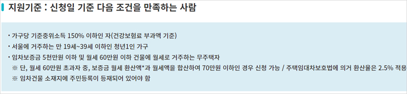 서울시는 실질적으로 주거비 부담을 크게 느끼는 청년의 어려움을 덜어주기 위해 임차보증금과 월세가 낮은 구간(보증금 1000만원 이하, 월세 50만 원 이하)에 많은 인원을 배정(1만5000명, 75%)했다고 합니다.