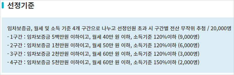 서울시는 월세 및 임차보증금 및 소득을 기준으로 4개 구간으로 나눠 청년월세 대상자를 선발한다고 합니다. 신청자가 선정인원을 초과할 경우에는 구간별 전산 무작위 추첨으로 선정한다고 합니다.
