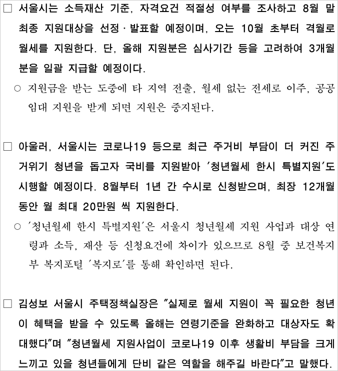 참고로 서울시는 코로나19 등으로 최근 주거비 부담이 더 커진 주거위기 청년을 돕고자 국비를 지원받아 '청년월세 한시 특별지원'도 시행할 예정이라고 합니다. 8월부터 1년 간 수시로 신청을 받으며, 최장 12개월 동안 월 최대 20만원 씩 지원한다고 합니다. 청년월세 한시 특별지원은 서울시 청년월세 지원 사업과 대상 연령과 소득, 재산 등 신청요건에 차이가 있으므로 8월 중 보건복지부 복지포털 복지로를 통해 확인하면 된다고 합니다.