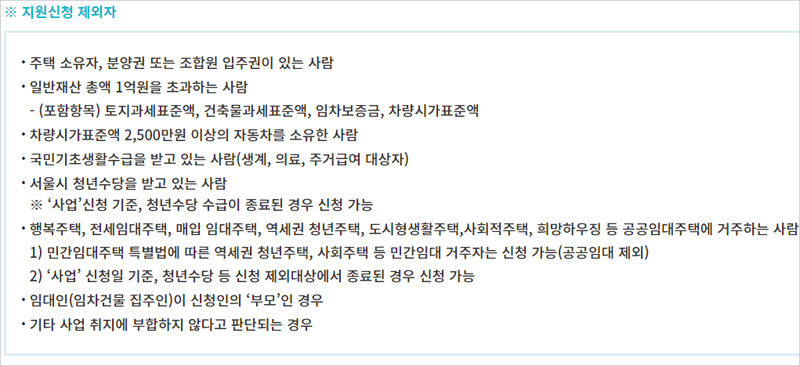 서울시 청년월세지원 신청 대상 중 일반재산 총액이 1억원을 초과하는 경우, 주택 소유자나 분양권 또는 조합원 입주권 보유자, 차량시가표준액 2500만원 이상의 차량 소유자, 공공 임대주택 거주 청년 등은 제외된다고 합니다. 또한 국민기초생활수급자(교육급여 수급자는 신청 가능)나 서울시 청년수당을 받고 있는 경우도 신청할 수 없다고 합니다.