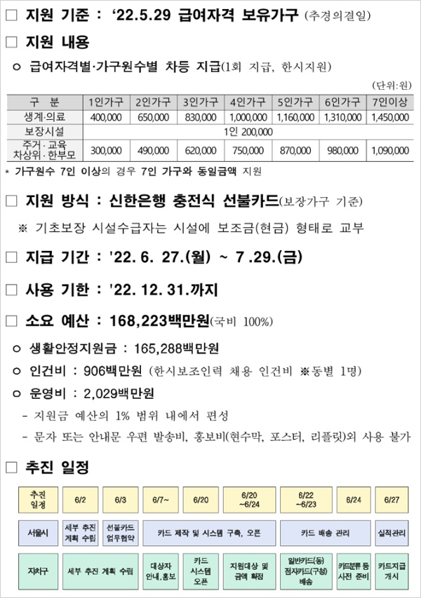 저소득층 한시 긴급생활지원금 지원기준은 2022년 5월 29일 추경 국회 통과일을 기준으로 급여자격 보유가구이며 지원절차는 지원가구 명단 추출 및 지자체 통보 → 대상 가구별 카드 지급 순으로 이뤄진다고 합니다. 읍 면 동 주민센터 등을 통해 대상자에게 직접 전달하는 방식이라고 합니다.