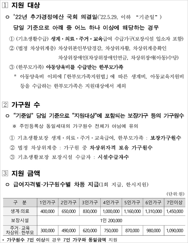 ▣ 보건복지부가 최근 급격한 물가상승에 따른 저소득층의 생계부담을 완화하고 소비 여력을 제고하기 위한 저소득층 한시 긴급생활지원금을 지급한다고 밝혔습니다. 저소득층 한시 긴급생활지원금 대상은 기초생활보장 수급자 약 179만 가구, 법정 차상위계층과 아동 양육비를 지원받고 있는 한부모 가구 약 48만 가구가 대상이며 약 227만 가구(중복 제외)에게 저소득층 한시 긴급생활지원금이 지급된다고 합니다.