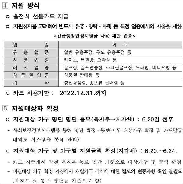 A. 이번 한시 긴급생활지원금 사업은 코로나19 기간 중 급격한물가상승으로 인한 부담이 상대적으로 집중되고 있는 저소득층생활안정 필요에 따라 추진되는 것이라고 하니다. 이에 따라 ① 일부 유흥, 향락, 사행업소 등의 업종은 사용을 제한할 필요가 있고 ② 연내 사용을 독려하기 위해서라고 합니다.