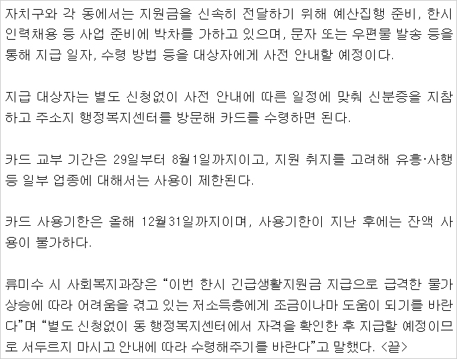 저소득층 한시 긴급생활지원금 신청 방법에 대해 알아보면 별도의 신청 없이 읍, 면, 동 주민센터를 찾아가면 카드사의 선불형 카드 혹은 지역화폐 형태로 지원금을 받을 수 있다고 합니다. 저소득층 한시 긴급생활지원금 사업기간은 2022년 6월부터 8월까지 3개월간이며 카드지급개시는 최초 6월 24일이며 사용 기한은 올해 12월 31일까지라고 합니다.