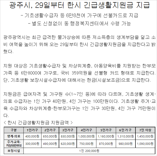 광주광역시 저소득층 한시 긴급생활안정지원금 지급대상 지원금액 지급방법