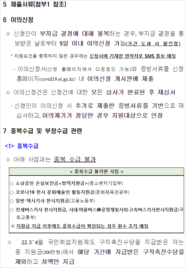특고 프리랜서 6차 재난지원금 신규신청 대상자는 소상공인 손실보전금(방역지원금) 등 유사사업과는 중복해 수급할 수 없다고 합니다. 코로나19 한시 문화예술인 활동지원금, 일반 택시기사 한시지원금, 전세버스기사 한시지원금, 시내 및 마을버스 비공영제 및 시외 고속버스기사 한시지원금 등이 있다고 합니다. 지원금 지급 이후에도 중복수급이 확인되는 경우에는 환수 조치할 방침이라고 합니다.