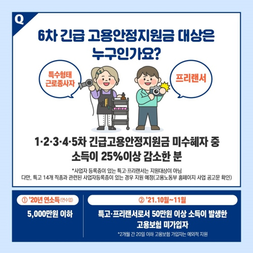 오늘은 특고 프리랜서 6차 재난지원금 신규신청 대상 및 특고 프리랜서 6차 재난지원금 신규신청 자격요건, 특고 프리랜서 6차 재난지원금 신규신청 방법, 지원제외대상, 지급시기 등에 대해 알아보도록 하겠습니다.