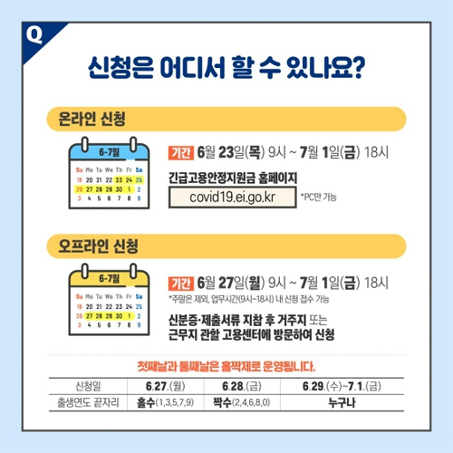 6차 긴급 고용안정 지원금 대상확인 신청 방법 중 온라인 신청이 어려운 경우 27일부터 고용센터에 방문신청도 가능하다고 합니다. 업무시간 내에 신분증, 통장사본 및 증빙서류를 지참하여 고용센터에서 신청하면 된다고 합니다. 다만, 현장 신청 첫 이틀은 출생연도 끝자리에 따라 홀짝제로 운영된다고 합니다.