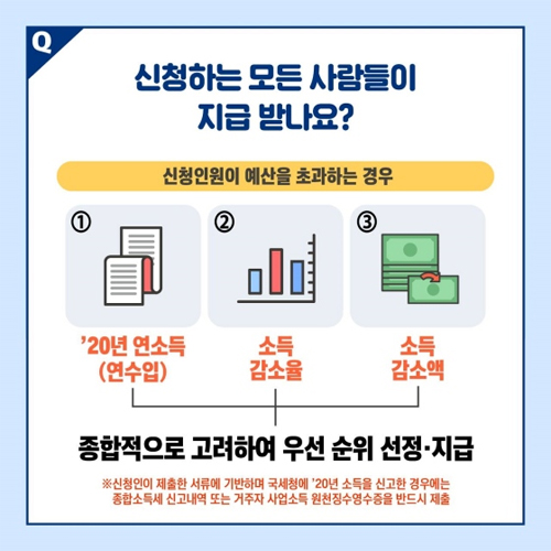 비교 대상 기간은 △2021년 3월 △2021년 4월 △2021년 10월 △2021년 11월 △2019년 월평균 소득 △2020년 월평균 소득 중 하나를 택하면 된다고 합니다. 만약 신청인원이 예산 범위를 초과하는 경우에는 연소득과 소득감소 규모, 소득감소율 등을 종합적으로 고려해 우선순위에 따라 지원된다고 합니다.