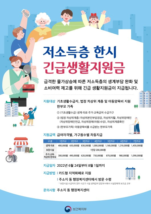 저소득층 한시 긴급생활지원금 신청 방법에 대해 알아보면 별도의 신청 없이 읍, 면, 동 주민센터를 찾아가면 카드사의 선불형 카드 혹은 지역화폐 형태로 지원금을 받을 수 있다고 합니다. 저소득층 한시 긴급생활지원금 사업기간은 2022년 6월부터 8월까지 3개월간이며 카드지급개시는 최초 6월 24일이며 사용 기한은 올해 12월 31일까지라고 합니다.
