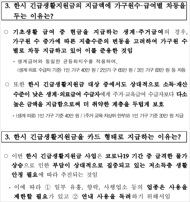 Q. 저소득층 한시 긴급생활지원금의 지급액에 가구원수 및 급여별 차등을두는 이유는?
