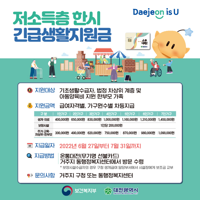 기타 문의사항은 주소지 동행정복지센터, 시청 복지정책과(270-4632), 동구청 생활보장과(251-4493), 중구청 사회복지과(606-7153), 서구청 사회복지과(288-3111), 유성구청 희망복지과(611-2879), 대덕구청 복지정책과(608-6765)을 통해 확인할 수 있다고 합니다.