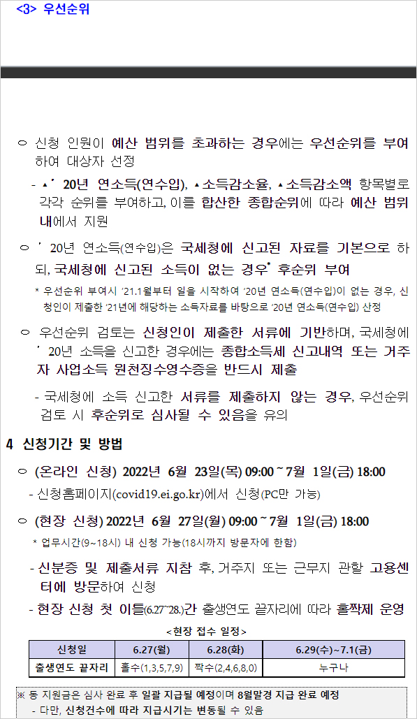 비교 대상 기간은 △2021년 3월 △2021년 4월 △2021년 10월 △2021년 11월 △2019년 월평균 소득 △2020년 월평균 소득 중 하나를 택하면 된다고 합니다. 만약 신청인원이 예산 범위를 초과하는 경우에는 연소득과 소득감소 규모, 소득감소율 등을 종합적으로 고려해 우선순위에 따라 지원된다고 합니다.