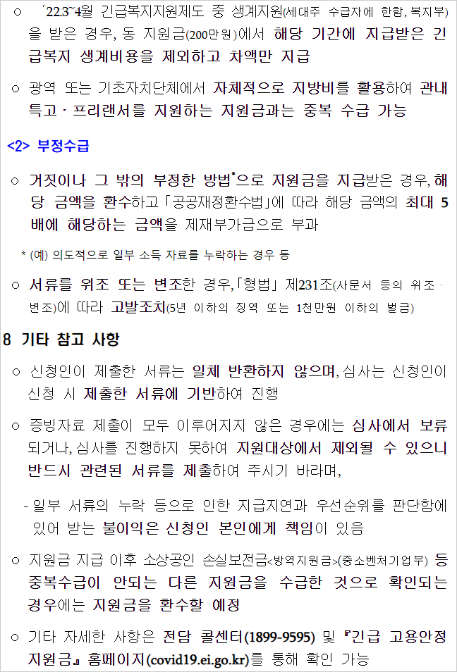 거짓이나 그 밖의 부정한 방법으로 지원금을 지급받은 경우에는 해당 금액에 대한 환수조치가 이뤄진다고 합니다. 또한 공공재정환수법에 따라 해당 금액의 최대 5배에 해당하는 금액이 제재부가금으로 부과된다고 합니다.