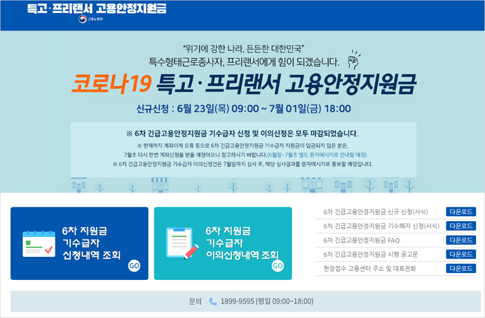 신규신청 특고 프리랜서 고용안전지원금 지급대상 및 자격요건, 신청 방법, 지급일정, 이의신청과 유의사항 등 기타 자세한 사항은 전담 콜센터(1899-9595) 및 긴급 고용안정 지원금 홈페이지(covid19.ei.go.kr)를 통해 확인이 가능하다고 합니다.
