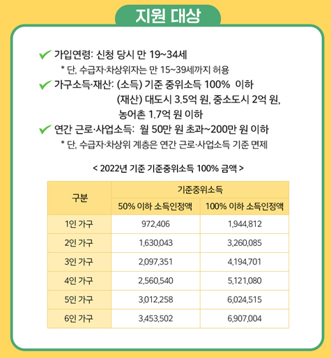 또한 가입 청년이 속한 ③ 가구소득은 기준 중위소득의 100% 이하(1인가구 1,944,812원 2인가구 3,260,085원 3인가구 4,194,701원 4인가구 5,121,080 원 5인가구 6,024,515원 6인가구 6,907,004)여야 합니다. ④ 가구재산은 대도시 거주자는 3억5000만원, 중소도시는 2억원, 농어촌은 1억7000만원 이하여야 청년 내일저축계좌 가입대상이 된다고 합니다.