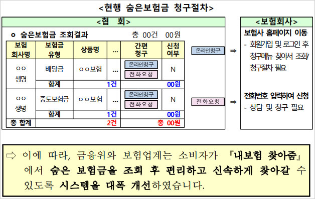 기존 시스템에서는 숨은 보험금 조회만 가능하고 실제 보험금을 청구하기 위해서는 개별 보험회사에 방문해야 하는 등의 불편이 따랐다고 하는데요. 하지만 보험 가입자의 가입 내역과 숨은 보험금을 통합 조회할 수 있는 숨은 보험금 찾기 조회 사이트 내 보험 찾아줌 홈페이지에서 보험금 조회 뿐만 아니라 청구까지 가능해지도록 개선된다고 해요.