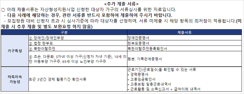 청년내일저축계좌 신청서류 중 추가 제출서류는 자산 자산형성지원사업을 신청한 대상자 가구의 서류심사를 위한 자료라고 합니다. 위와 같은 사례에 해당하는 경우에는 관련 서류를 반드시 포함하여 제출해야 한다고 합니다. 모집정원 대비 신청자 초과 시 심사기준에 따라 대상자를 선정하며, 서류 미제출 시 해당 항목의 최저점이 적용된다고 합니다. 미제출 시 추후 제출 및 별도 보완요청을 하지 않는다고 합니다.