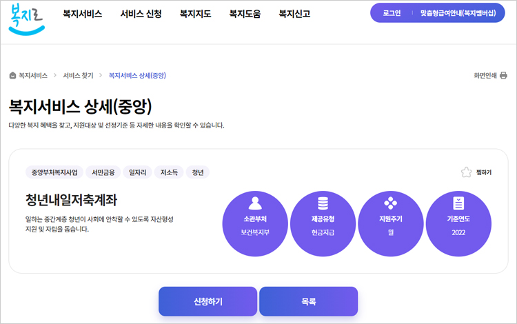 청년내일저축계좌 신청은 가입을 희망하는 청년은 복지로를 통해 신청이 가능하다고 합니다. 청년내일저축계좌 신청대상 중 방문 신청이 필요한 경우 거주지 읍면동 주민센터에서 신청할 수 있다고 합니다.