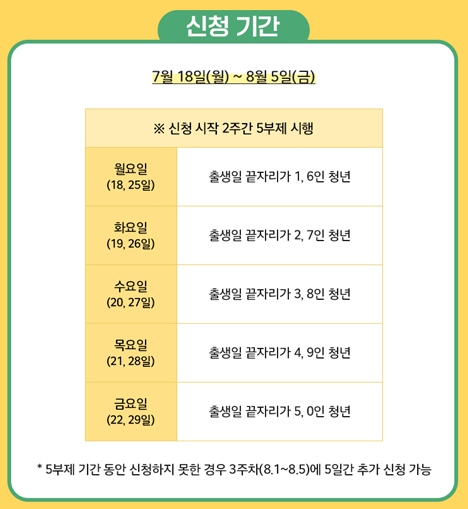 이에 출생일 끝자리가 1 또는 6이면 월요일(18, 25일), 2 또는 7일이면 화요일(19, 26일), 3 또는 8이면 수요일(20, 27일), 4 또는 9이면 목요일(21, 28일), 5 또는 0이면 금요일(22, 29일)에 신청 가능합니다. 5부제 기간 신청을 하지 못한 경우에는 8월 1~5일에 추가 신청이 가능하다고 합니다.