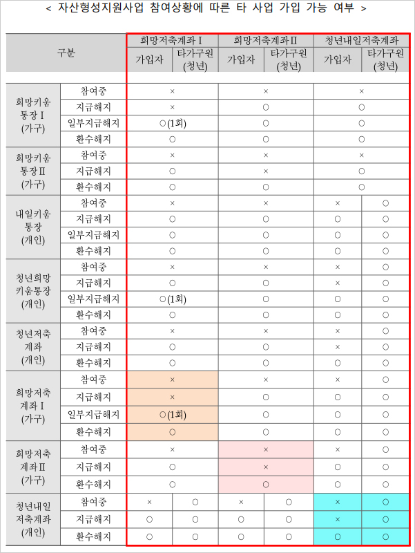 ▶ 단, 지원대상과 목적이 다른 사업에 참여하고 있는 자(가구)는 중복참여가 가능합니다.(예: 아동 및 청소년을 대상으로 하는 '디딤씨앗통장', '꿈나래통장' 등)