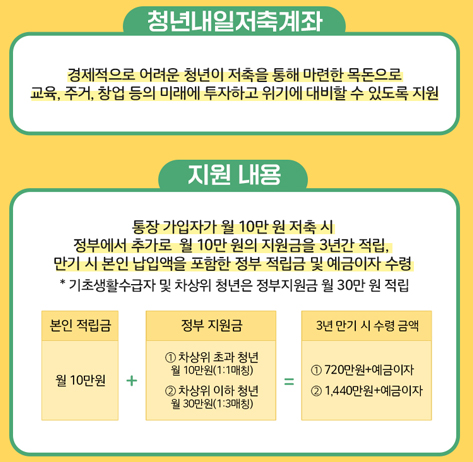 청년내일저축계좌에 가입하면 본인 적립액 월 10만원에 정부 지원금 월 10만원을 추가 적립해 3년간 지원된다고 합니다. 만기 시 본인 납입액 360만원을 포함해 총 720만원의 적립금과 예금이자를 수령할 수 있다고 합니다. 기초생활수급자 및 차상위 청년은 정부 지원금 월 30만원을 적립해 3년 뒤 만기 시 1440만원의 적립금과 예금이자를 수령할 수 있다고 합니다.