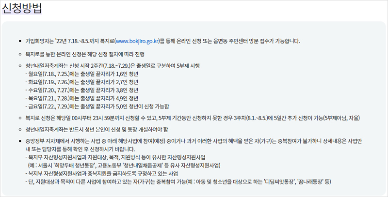 참고로 청년내일저축계좌 신청기간은 7월 18일에서 오는 8월 5일까지라고 합니다. 신청 중 일시에 몰리는 현상을 방지하기 위해 가입 첫날인 18일부터 29일까지는 출생일 기준으로 신청 5부제가 시행된다고 해요.