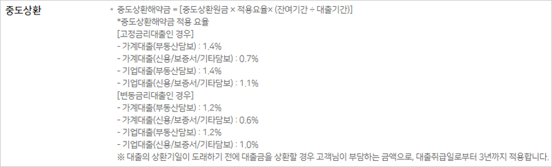 ※ 대출의 상환기일이 도래하기 전에 대출금을 상환할 경우 고객님이 부담하는 금액으로, 대출취급일로부터 3년까지 적용합니다.