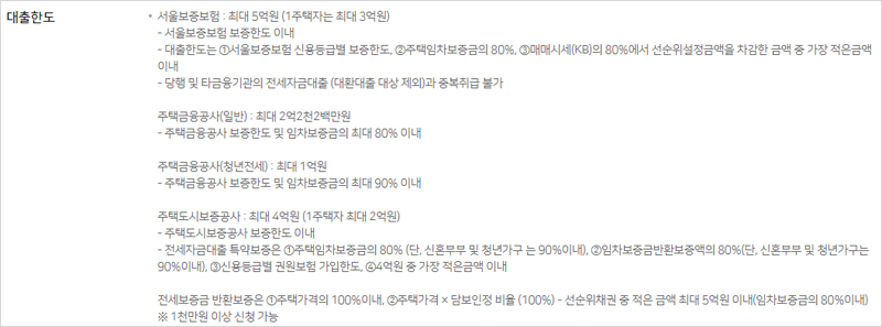 - 주택금융공사 보증한도 및 임차보증금의 최대 80% 이내