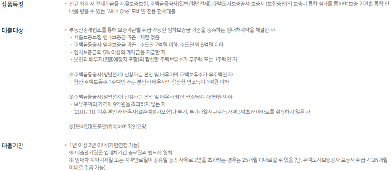 ▶ 신규 입주 시 전세자금을 서울보증보험, 주택금융공사(일반/청년전세), 주택도시보증공사 보증서 (보험증권)의 보증서 통합 심사를 통하여 보증 기관별 통합 안내를 받을 수 있는 "All In One" 모바일 전용 전세대출입니다.