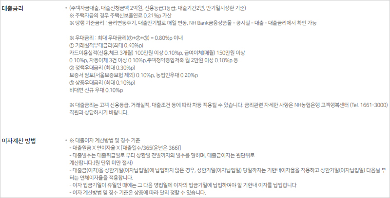 ※ 대출금리는 고객 신용등급, 거래실적, 대출조건 등에 따라 차등 적용될 수 있습니다. 금리관련 자세한 사항은 NH농협은행 고객행복센터 (Tel. 1661-3000) 직원과상담하시기 바랍니다.