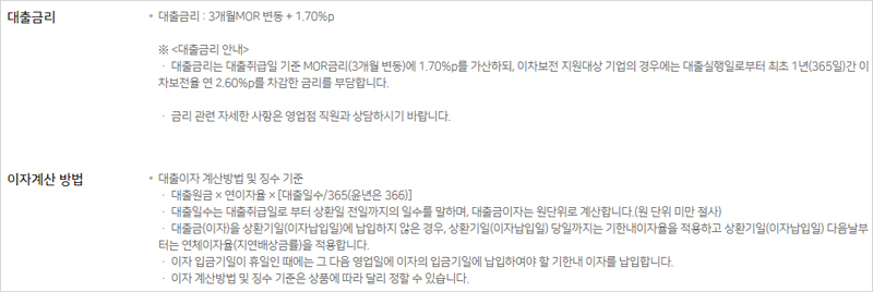 NH농협 소상공인 희망대출 플러스 특례보증대출 금리는3개월MOR변동+1.70%p라고 합니다. 대출금리는 대출취급일 기준 MOR금리(3개월 변동)에 1.70%을 가산하되 이차보전 지원대상 기업의 경우에는 대출실행일로부터 최초1년(365일)간 이차보전율 연2.60%p를 차감한 금리를 부담하면 된다고 합니다.