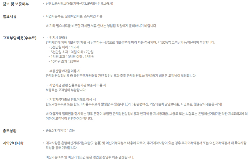 NH농협 소상공인 희망대출플러스 특례보증 서류로는 ▶ 사업자 등록증 ▶ 실명확인서류 ▶ 소득확인서류 등이 필요한데 기타 필요서류를 비롯한 자세한 서류 안내는 영업점 직원에게 문의하면 된다고 합니다. 인지세 및 중도상환해약금은 없다고 합니다.