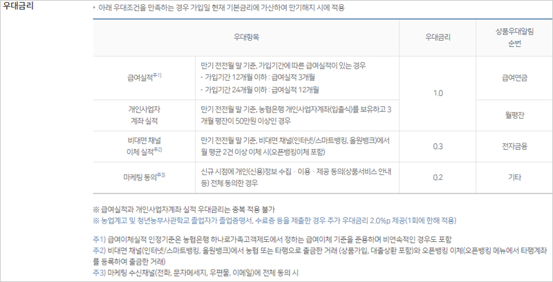 주1) 급여이체실적 인정기준은 농협은행 하나로가족고객제도에서 정하는 급여이체 기준을 준용하며 비연속적인 경우도 포함
