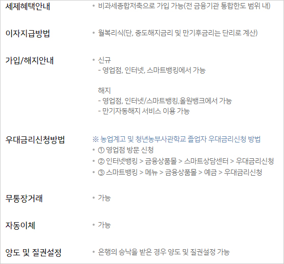 ※ 농업계고 및 청년농부사관학교 졸업자가 졸업증명서, 수료증 등을 제출한 경우 추가 우대금리 2.0%p 제공(1회에 한해 적용)