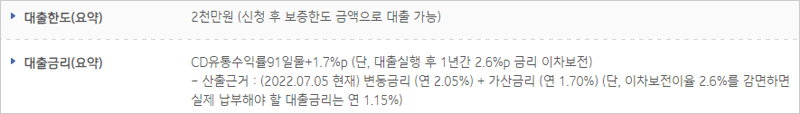 - 산출근거 :(2022.07.05 현재) 변동금리(연2.05%) + 가산금리(연 1.70%) (단 이차보전이율 2.6%를 감면하면 실제 납부해야 할 대출금리는 연 1.15%)