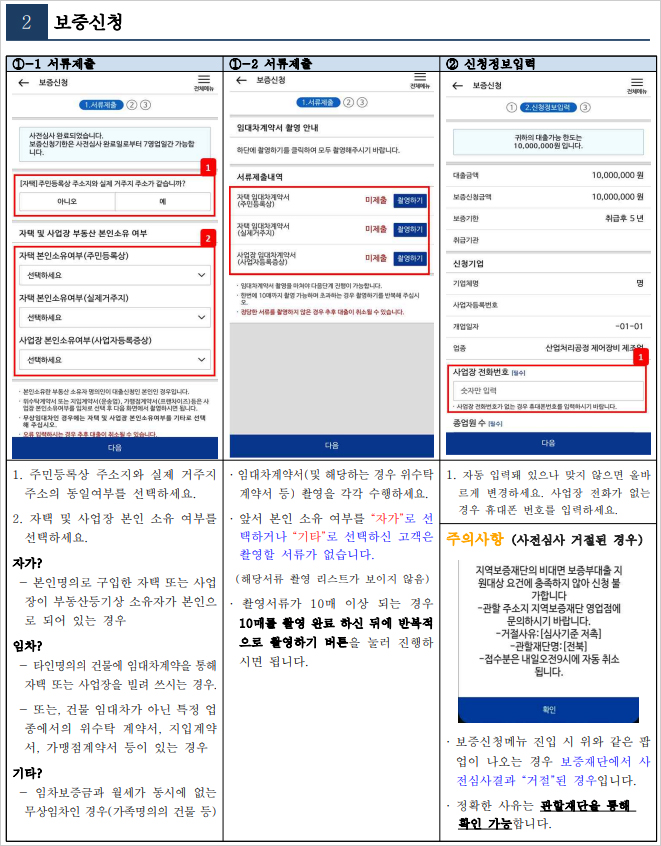 IBK기업은행 소상공인 희망대출플러스 특례보증 보증신청은 ①-1 서류제출 → ①-2 서류제출 → ② 신청정보입력 → ② 신청정보입력(계속) → ③ 보증신청완료 순으로 이뤄진다고 해요. ※ 보증승인통지 안내→대출실행진행 문자메시지가(SMS) 발송 된다고 합니다.