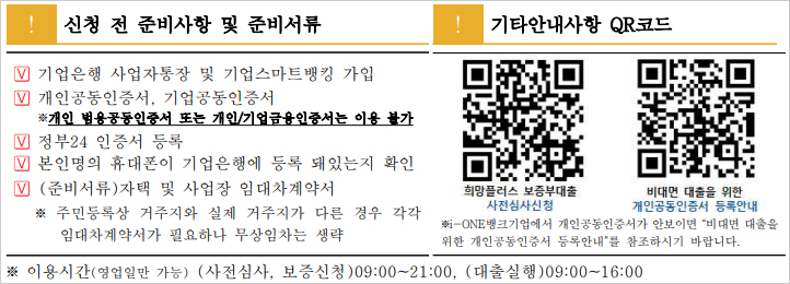 IBK기업은행 소상공인 희망대출플러스 특례보증 신청방법에 앞서 준비사항 및 준비서류가 있는데요. 먼저 ▶ 기업은행 사업자통장 및 기업스마트뱅킹 가입, ▶개인공동인증서, 기업공동인증서를 준비해야 한다고 해요. 다만 개인 범용공동인증서 또는 개인/기업금융인증서는 이용이 불가능 하다고 해요. 또한 ▶정부24 인증서 등록 ▶본인명의 휴대폰이 기업은행에 등록 돼있는지 확인이 필요하구요. ▶ (준비서류)자택 및 사업장 임대차계약서 가 필요한데요. 주민등록상 거주지와 실제 거주지가 다른 경우 각각 임대차계약서가 필요하나 무상임차는 생략 가능하다고 해요.