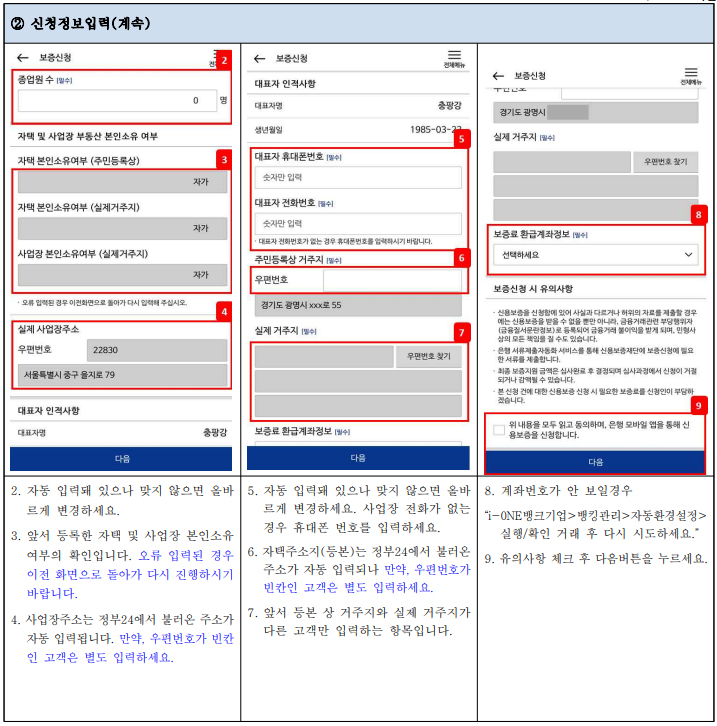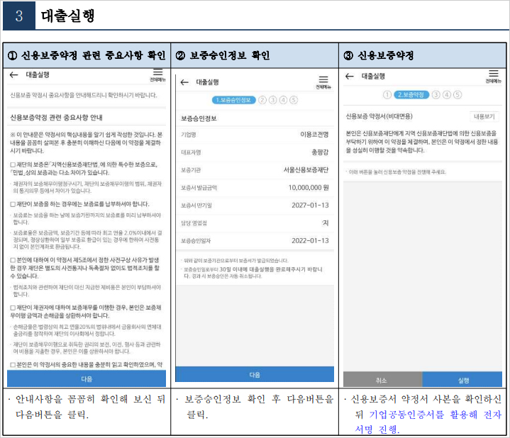 IBK기업은행 소상공인 희망대출플러스 특례보증 대출실행 절차는 ① 신용보증약정 관련 중요사항 확인 → ② 보증승인정보 확인 → ③ 신용보증약정 → ④ 정보입력→ ⑤ 정보확인 → ⑤ 정보확인(계속) 및 대출실행완료 순으로 진행 된다고 해요.