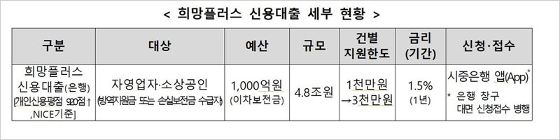 더욱 폭넓은 지원을 위해 소상공인 희망플러스 신용대출의 대출한도를 기존 1천만원에서 3천만원으로 확대하고 지원대상도 손실보전금 수급자까지 확대하기로 했다고 합니다. 은행연합회와 신용보증기금은 8일 금융위원회의 자영업자 및 소상공인 맞춤형 금융지원에 따라 희망플러스 신용대출의 대출한도 및 지원대상을 확대 개편한다고 밝혔다고 합니다.