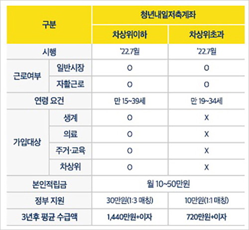 청년내일저축계좌 자격조건 가입 대상은 신청 당시 ① 만 19~34세 일하는 청년이라고 하구요. 근로소득 및 사업소득은 ② 월 50만원 초과~200만원 이하인 경우 가입대상이 된다고 합니다.