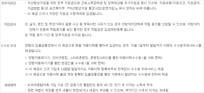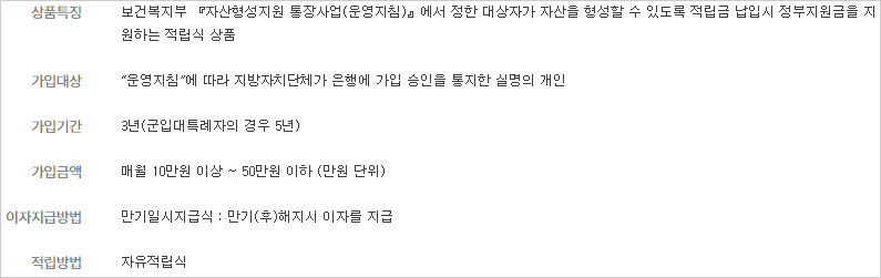 ▶ 보건복지부 자산형성지원 통장사업(운영지침)에서 정한 대상자가 자산을 형성할 수 있도록 적립금 납입시 정부지원금을 지원하는 적립식 상품이라고 합니다.