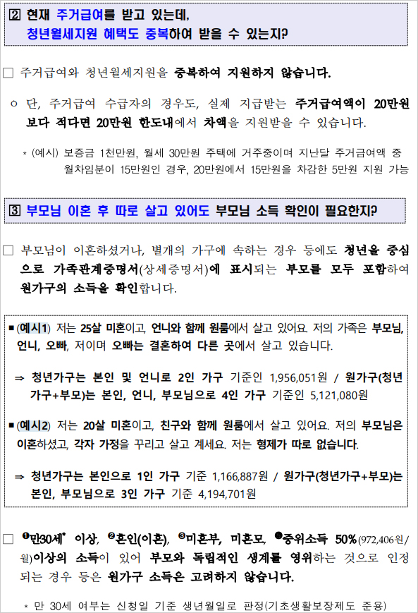 만 30세 이상, 혼인, 미혼부·모 또는 기준중위소득 50%(1인 기준 월 97만2406원) 이상 소득이 있어 부모와 생계를 달리한다고 볼 수 있는 청년은 부모와 관계없이 청년가구 소득 및 재산만 확인한다고 합니다.