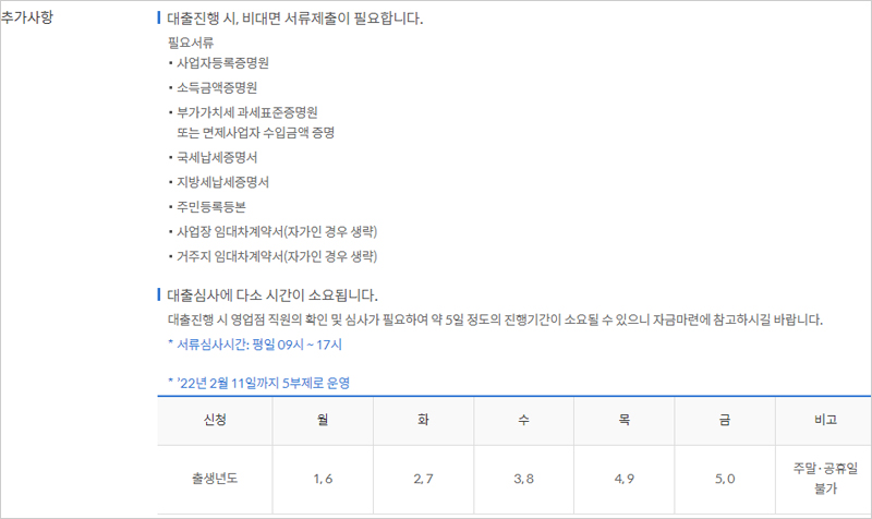 다만 대출 진행시 영업점 직원의 확인 및 심사가 필요하여 약 5일 정도의 진행기간이 소요될 수 있기 때문에 자금마련에 참고 해야 한다고 합니다. 참고로 서류심사시간은 평일 09시~17시까지라고 합니다.