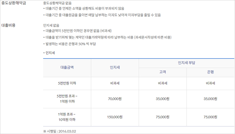 중도상환해약금은 없다고 합니다. 대출 기간 중 언제든 소액을 상환해도 비용이 부과되지 않는다고 합니다. 또한 대출기간 중 대출원금을 줄이면 매달 납부하는 이자도 낮아져 이자부담을 줄일 수 있다고 합니다. 대출금액이 5천만원 이하인 경우에는 인지세 또한 없다고 합니다.