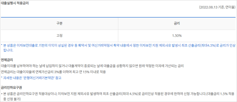 신한은행 희망플러스 신용이차보전대출 금리는 대출취급일로부터 최대 1년까지 연 1.50% 고정금리가 적용된다고 합니다. 기한의 이익이 상실된 경우 등 확약서 및 여신거래약정서 특약 내용에서 정한 이차보전 지원 제외사유 발생시 최초 산출금리(최대 4.5%)로 금리가 인상된다고 합니다.